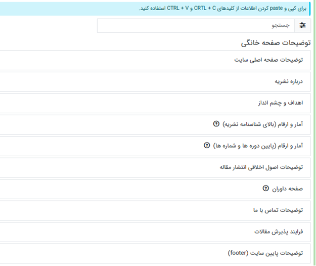 مدیر سامانه: تنظیمات نشریه: عنوان نشریه و توضیحات سامانه: توضیحات صفحه خانگی