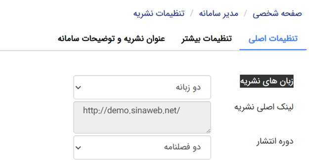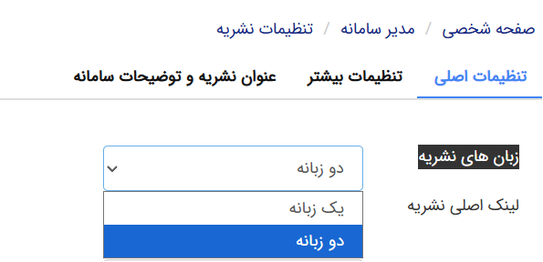 - نکته مهم: سامانه از ابتدا قابلیت دو زبانه بودن را دارد. زبان اصلی و دوم در زمان راهاندازی اولیه توسط تیم پشتیبانی تنظیم میشود، اما شما به عنوان مدیر میتوانید زبان دوم را در هر زمان غیرفعال کنید. برای این کار کافی است یکی از دو گزینه دوزبانه یا یکزبانه مقابل زبانهای نشریه را انتخاب کنید.