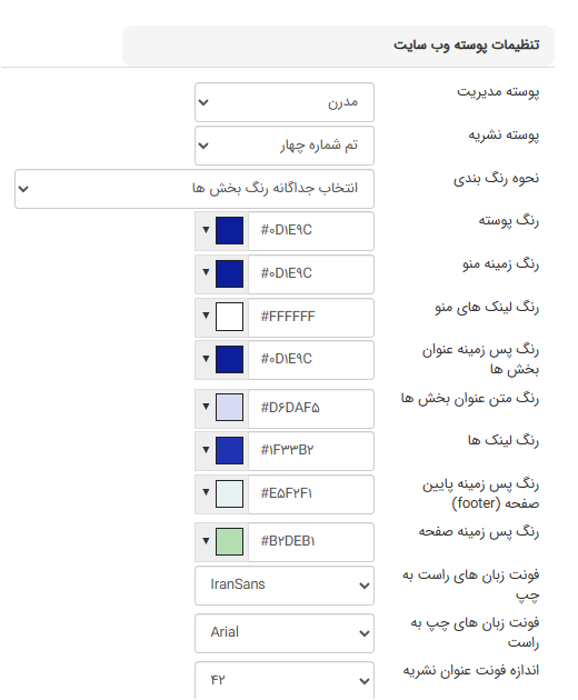 در بخش تنظیمات پوسته وبسایت میتوانید موارد زیر را تغییر دهید: