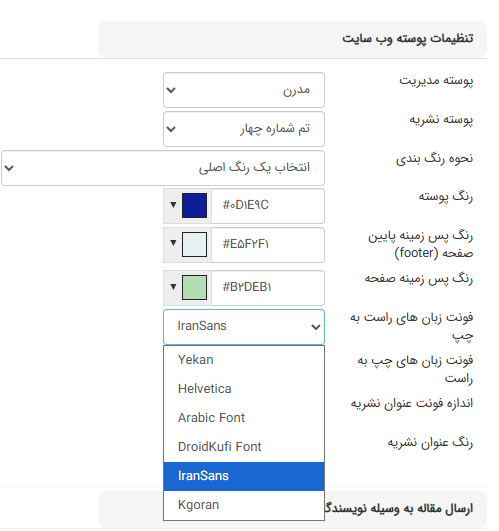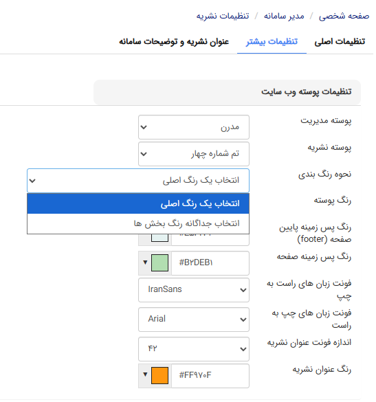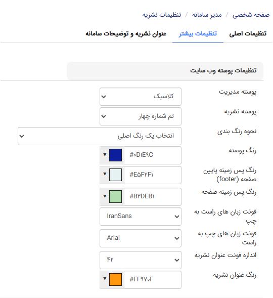 همچنین در این بخش میتوانید رنگ پوسته، رنگ پسزمینه پایین صفحه (فوتر)، رنگ پسزمینه صفحه و رنگ عنوان نشریه را نیز انتخاب کنید. برای انتخاب دقیق رنگ میتوانید کد رنگ را تایپ کنید.