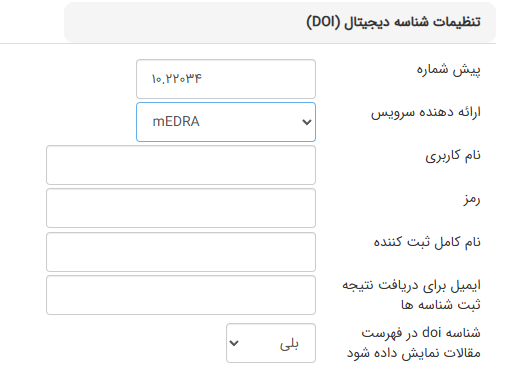 4.     اگر مایل هستید کد دی او آی هر مقاله علاوه بر نمایش در بخش نمایش مقاله در بخش فهرست مقالات هم نمایش داده شود، گزینه آخر را روی حالت بلی قرار دهید.