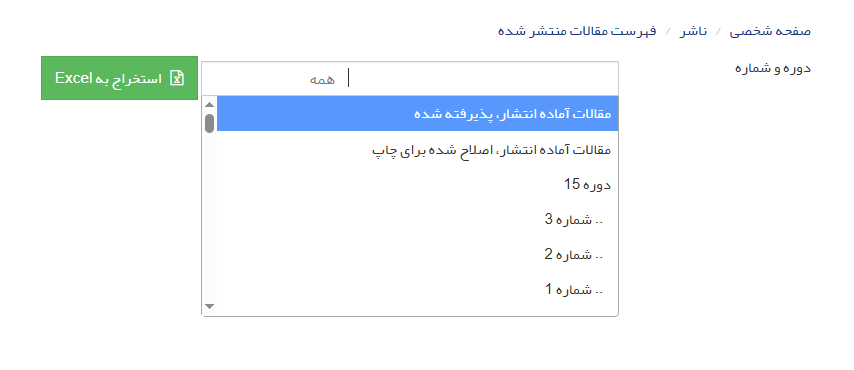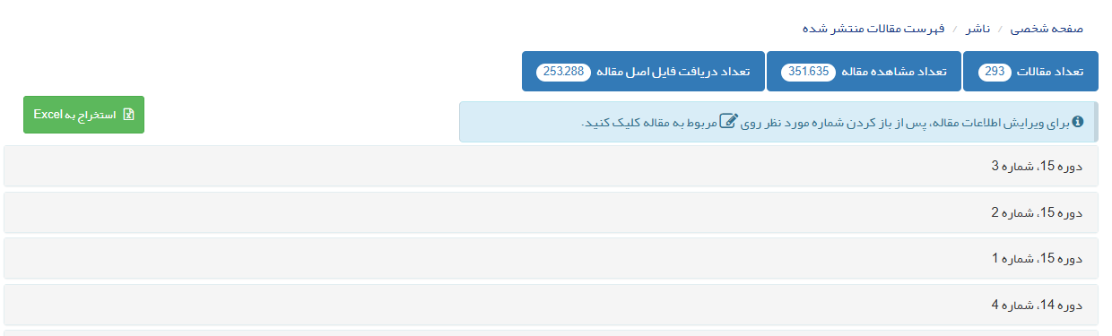 صفحهای حاوی تمام دورهها و شمارههای منتشرشده باز میشود. در بالای صفحه اطلاعات آماری را مشاهده میکنید. چنانچه قصد تهیه گزارش از مقالات منتشرشده را داشته باشید، کافی است روی دکمه سبزرنگ استخراج به اکسل کلیک کنید.