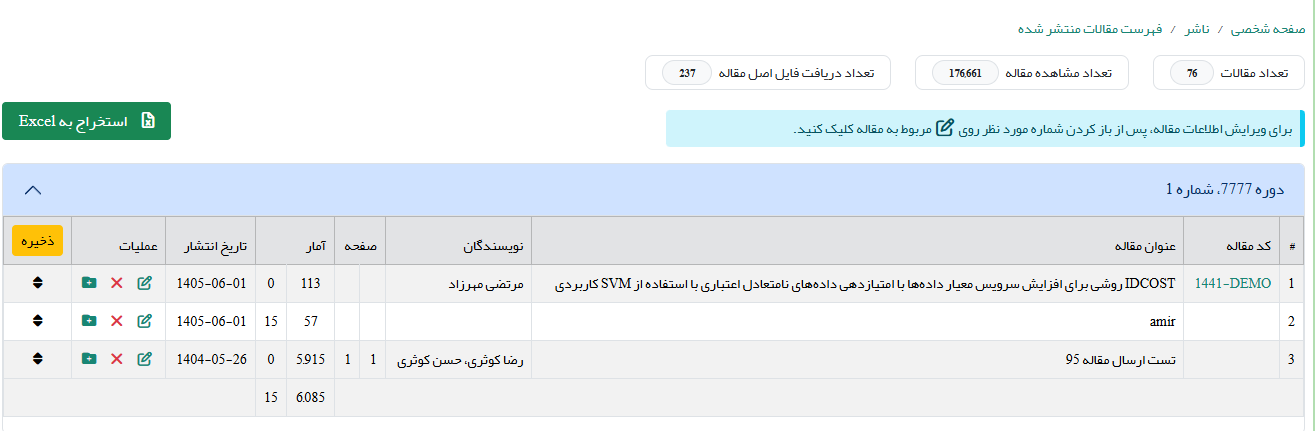 در این بخش میتوانید مقالات منتشر شده را ویرایش یا حذف کنید، آمار تعداد مشاهده مقاله و دریافت فایل مقاله را مشاهده کنید و گزارش کاملی از مقالات منتشر شده را دریافت کنید.