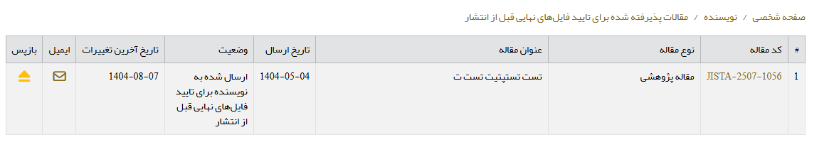 پاسخ: این وضعیت نشان میدهد که مقاله شما پذیرفته شده است و اکنون برای مراحل نهایی قبل از چاپ، نیاز به ارسال فایلهای نهایی و تکمیلی دارید.
