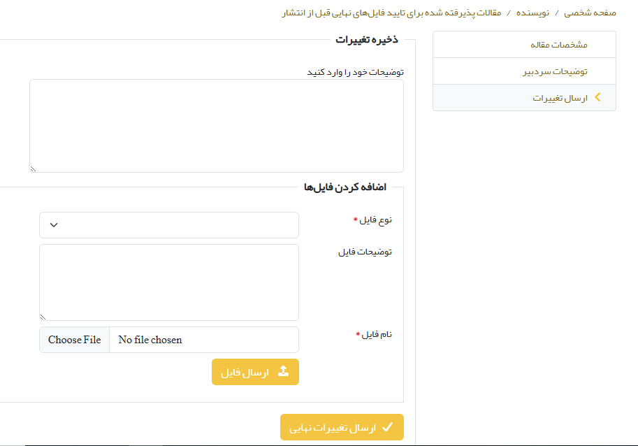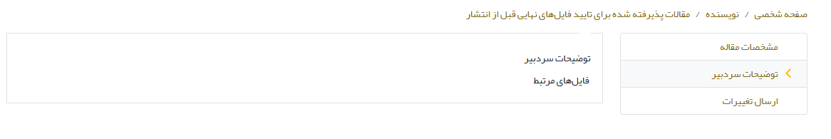 در صورتی که لازم باشد نویسنده فایلی را قبل از انتشار مقاله برای نشریه ارسال کند، مقاله به بخش «مقالات پذیرفته شده برای تایید فایلهای نهایی قبل از انتشار» منتقل میشود. نویسنده با مراجعه به این بخش میتواند فایلهای مورد نیاز را بارگذاری و برای سردبیر نشریه ارسال کند.