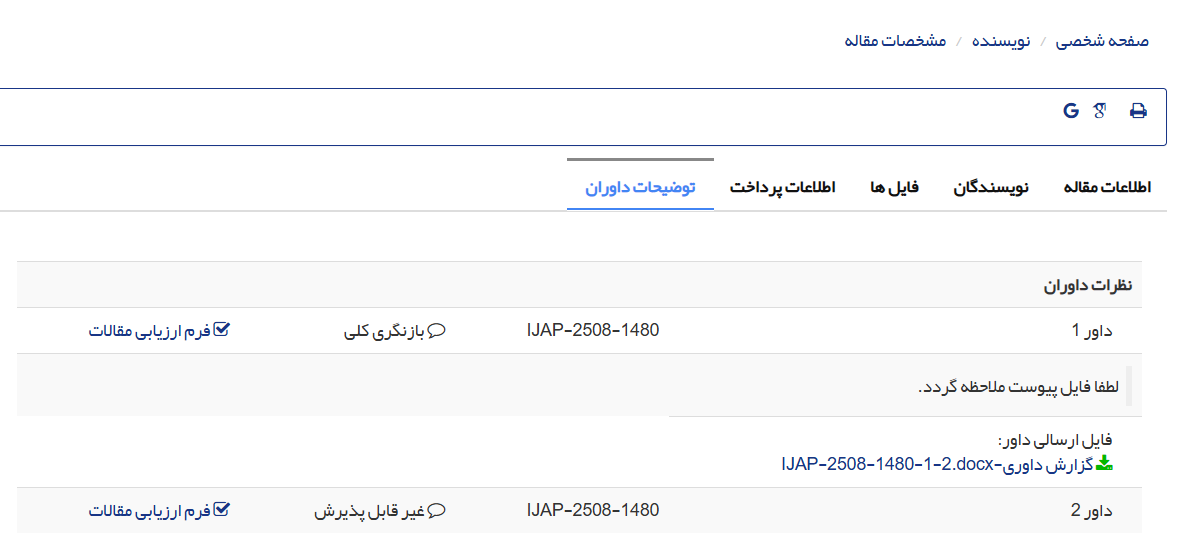 4. در صفحه مقاله، به تب «توضیحات داوران» بروید.