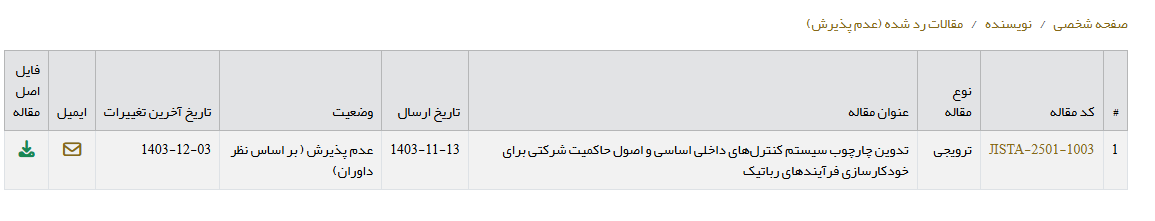 * مقاله به بخش «مقالات تصمیمگیریشده» و زیرمجموعه «مقالات ردشده (عدم پذیرش)» منتقل میشود.
