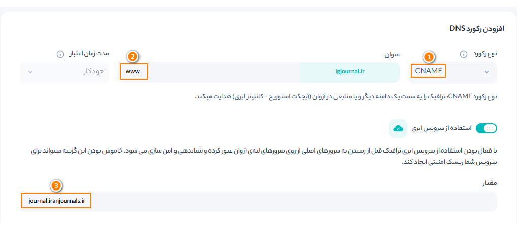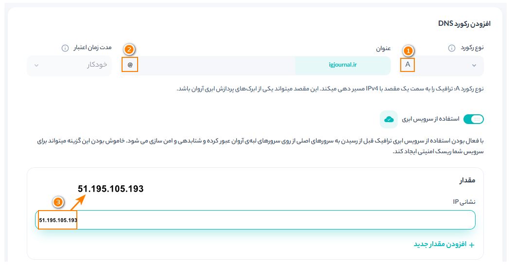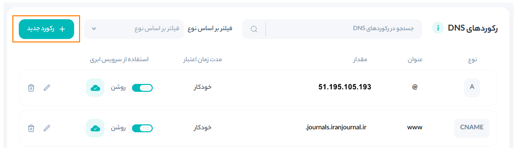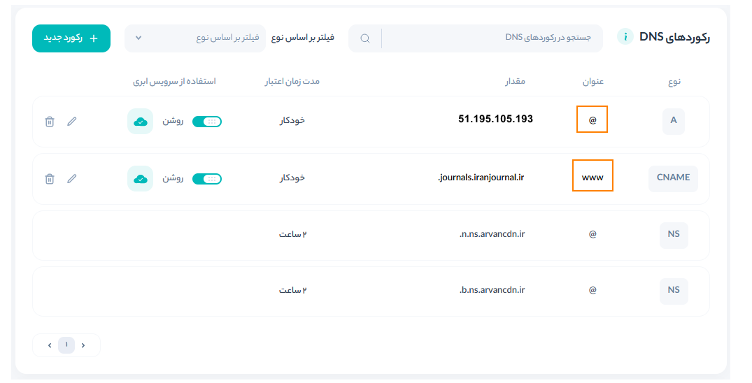 4. در صورت نبودن رکورد ها، ابتدا رکورد با عنوان @ , www را حذف نمایید.