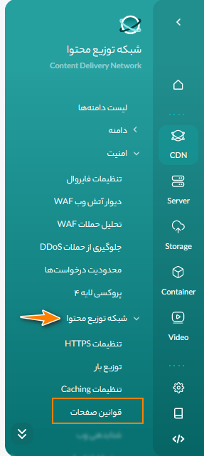 8. سپس از منوی سمت راست گزینه قوانین صفحه (زیر منو شبکه توزیع محتوا) را انتخاب کنید.