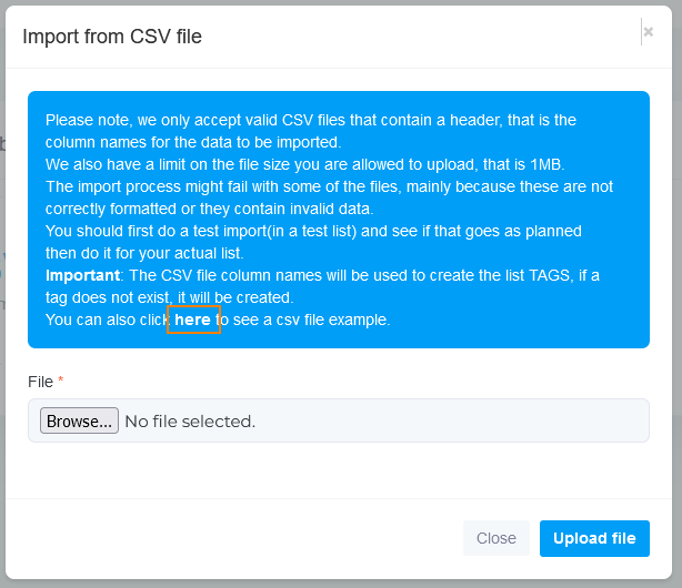 برای دریافت فایل نمونه روی این گزینه کلیک کنید و در فایل دانلود شده اطلاعات موجود را حذف کنید و فقط سطر اول که عنوان هر ستون را نشان می‌دهد، نگهدارید. فقط می‌توانید ستون ایمیل را نگهدارید و اطلاعات ایمیل را وارد کنید یا تمامی اطلاعات خواسته شده در فایل را تکمیل نمایید. تصمیم گیری در این رابطه با شماست. سپس فایل را در همین صفحه آپلود و ذخیره کنید و تا به پایان رسیدن آپلود صبر نمایید.