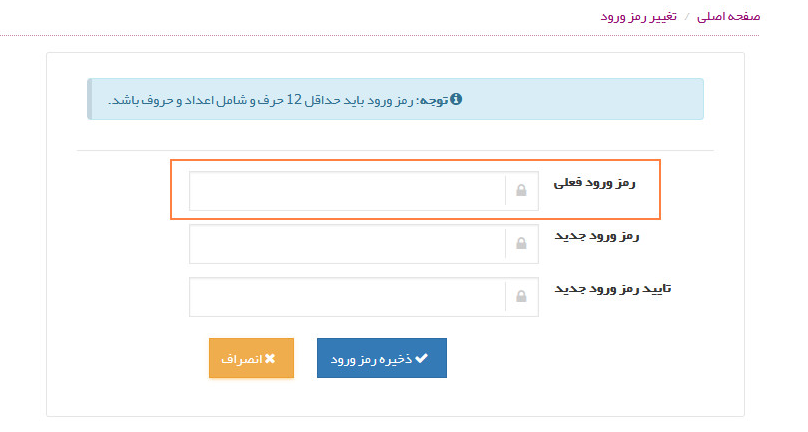ابتدا رمز عبور فعلی خود را وارد کنید. اگر این رمز روی کامپیوتر شما از قبل ذخیره بوده است می توانید از بخش password مرورگر رمز فعلی خود را ببینید و یا با استفاده از گزینه بازنشانی رمز ورود، رمز جدید خود را در ایمیل دریافت نمایید.