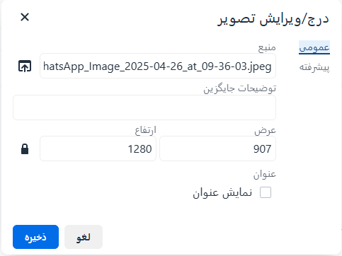 8ـ اگر لازم است ابعاد تصویر را تغییر دهید، در نهایت روی گزینه ذخیره در این باکس و همچنین ذخیره پایان صفحه کلیک کنید.