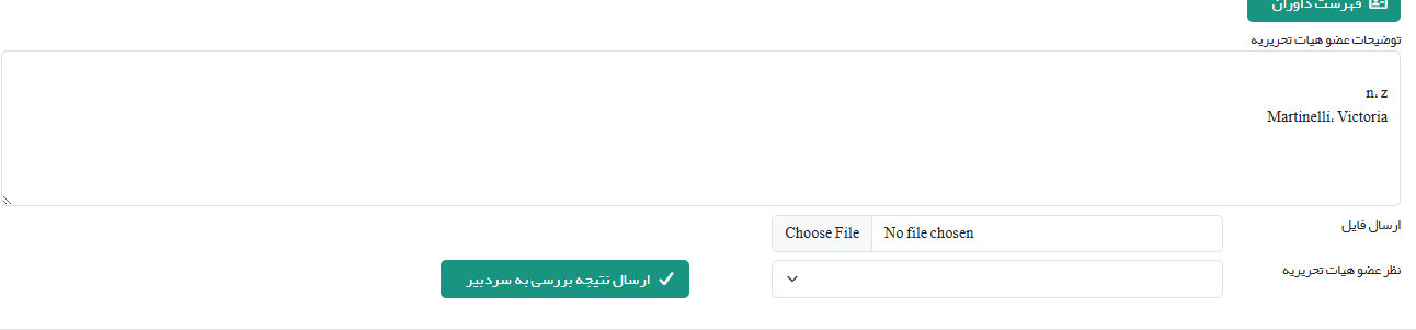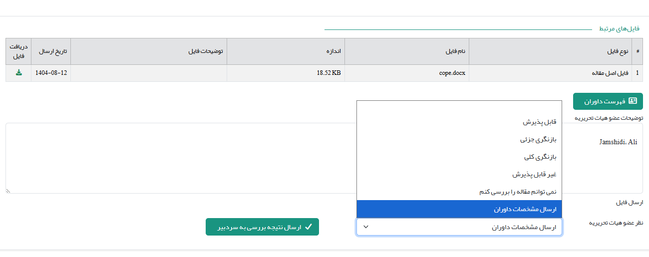 در بالای صفحه فایلهای ارسالی سردبیر، فهرست داوران و فرم ارسال نظر مشاهده میشود.