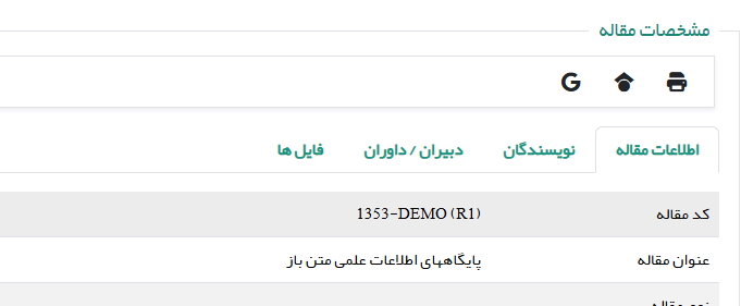 با کلیک بر روی کد هر مقاله صفحهای باز میشود که در انتهای آن اطلاعات مقاله و فایلهای مقاله وجود دارد. البته بسته به تنظیمات مدیر سامانه ممکن است بتوانید مشخصات و فایلهای نویسندگان و نظرات دیگر اعضای هیات تحریریه و داوران را نیز ببینید. همچنین با استفاده از علائم بالای صفحه میتوانید مشخصات مقاله را چاپ کنید یا عنوان مقاله را در گوگل یا گوگل اسکالر جستجو کنید.
