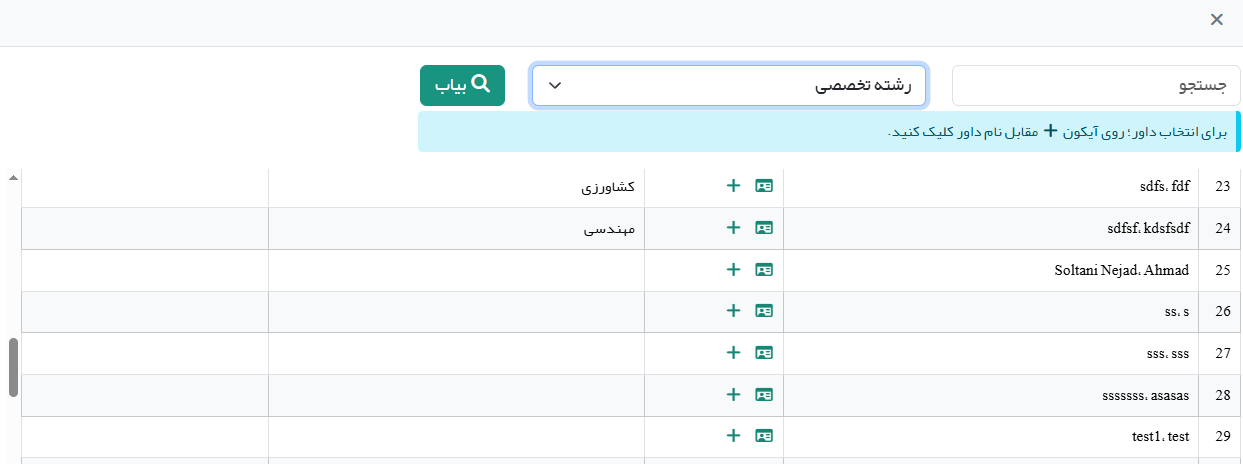 با کلیک بر روی فهرست داوران، نام داوران فعال در سامانه نشان داده میشود. میتوانید با استفاده از فیلتر رشته تخصصی، جستجوی دقیقتری را انجام دهید.