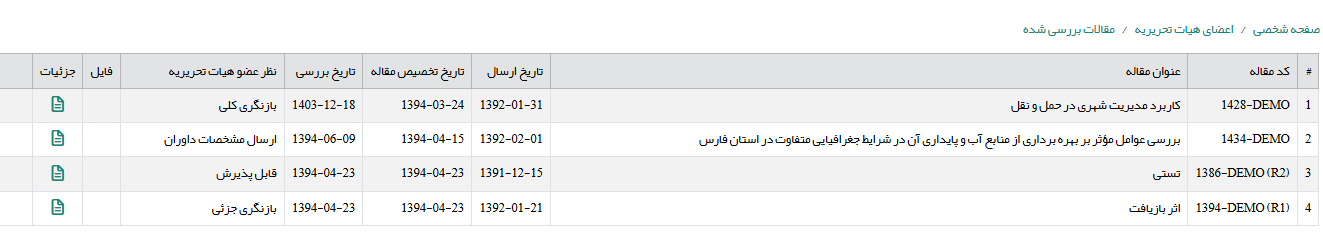 با کلیک بر روی این بخش صفحهای حاوی مقالات ارسالی سردبیر باز میشود. سردبیر میتواند مقالات را برای بررسی اولیه و معرفی داور یا برای بررسی نهایی به اعضای هیأت تحریریه ارسال کند.