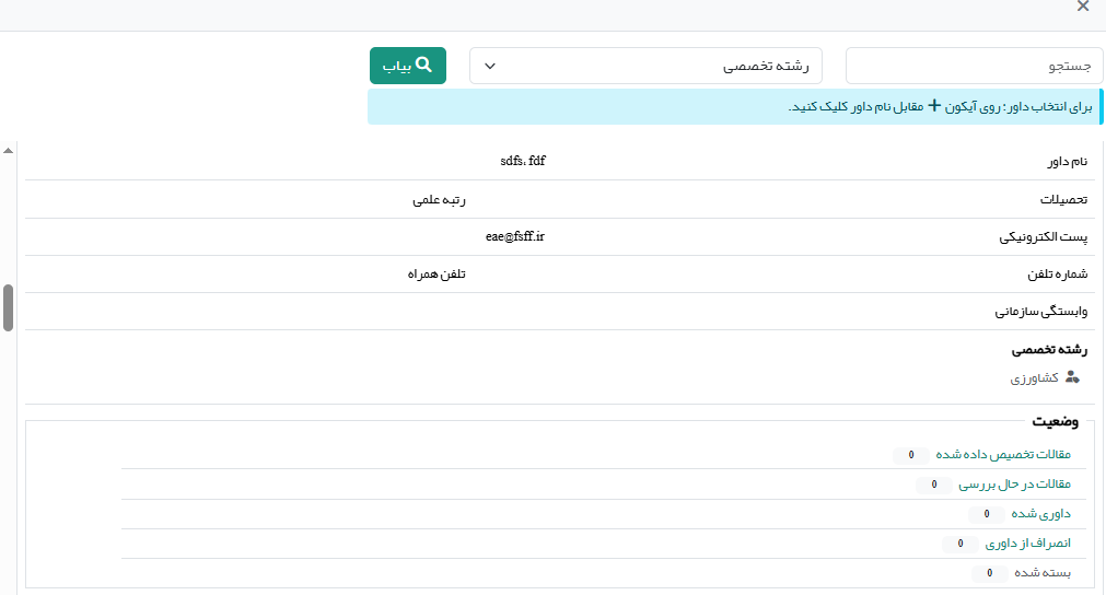 همچنین با نگه داشتن ماوس روی علامت جزئیات در ردیف نام هر داور مشخصات و وضعیت همکاری ایشان نشان داده میشود که میتواند معیار خوبی برای انتخاب داور باشد.