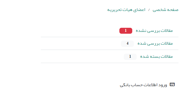 گزینه ورود اطلاعات حساب بانکی را در پایین صفحه اختصاصی اعضای هیأت تحریریه مشاهده میکنید. اگر نشریه به اعضای هیأت تحریریه حقالزحمه پرداخت میکند، لازم است این فرم را تکمیل کنید.