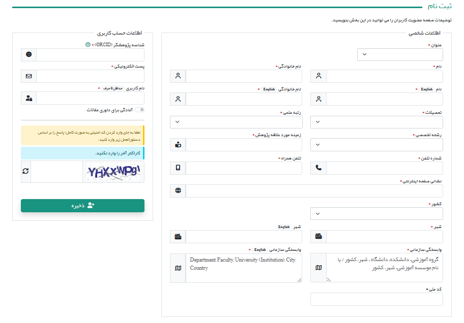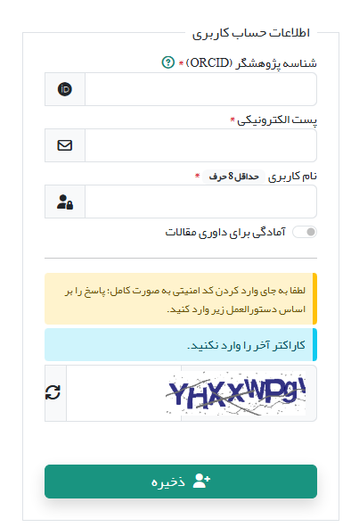 - شناسه پژوهشگر (ORCID) را به دقت وارد کنید. ارکید شناسه یا کدی است که جهت شناسایی نویسنده، محقق یا پژوهشگر به کار برده میشود.