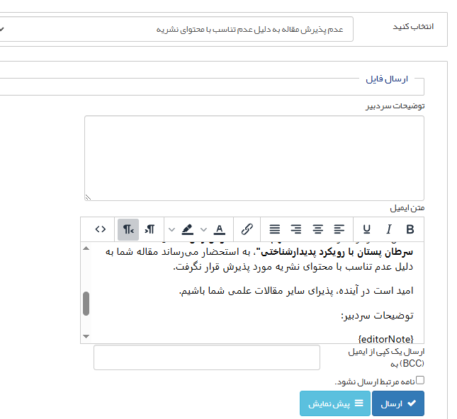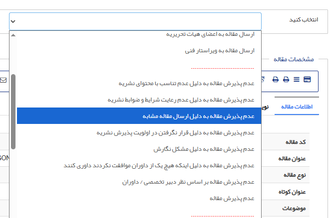 برای رد کردن مقاله لازم است که سردبیر روی کد مقاله کلیک کند و از منوی کشویی انتخاب کنید، یکی از دلایل عدم پذیرش مقاله را انتخاب کند. شش دلیل اول رد مقاله نیازی به ارسال نظرات داوران/ دبیران ندارد و مقالاتی که بنا به این دلایل رد میشوند، عموماً اصلاً برای داوری ارسال نمیشوند. در این صورت فرم زیر باز میشود که سردبیر میتواند در آن توضیحات لازم را جهت ارتقا مقاله به نویسندگان متذکر شود.