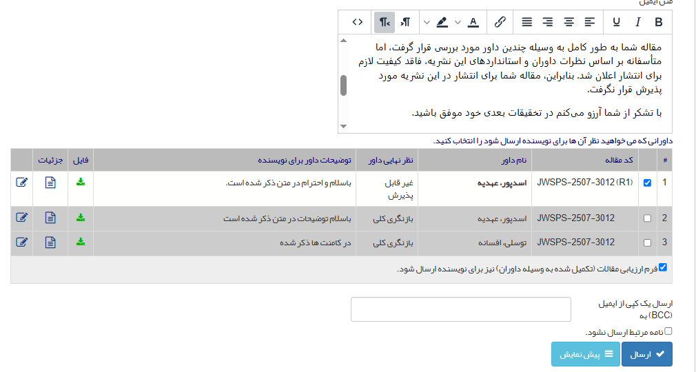 در اینجا لازم است سردبیر نظر داورانی را که حکم به رد مقاله دادهاند، انتخاب و برای نویسنده ارسال کند. همچنین سردبیر میتواند متن نامه پیشفرض را ویرایش و توضیحات خاص خود را به آن اضافه کند.