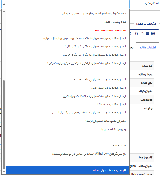 همچنین در فهرست مقالات در ستون وضعیت، در کنار وضعیت این مقاله علامت برگه مشاهده میشود که با نگه داشتن روی آن میتوان یادداشت سردبیر را ملاحظه کرد.