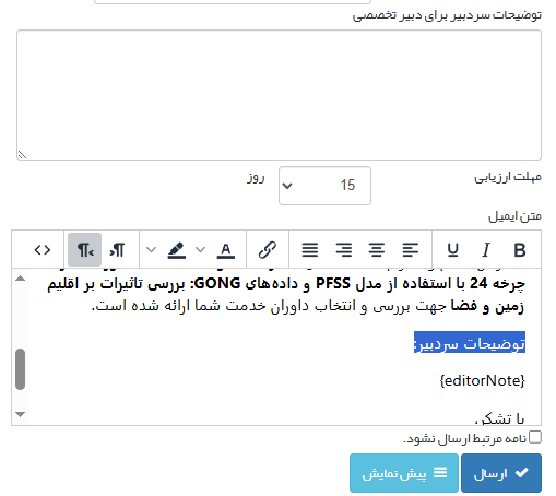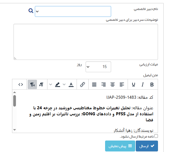 اگر لازم است توضیحاتی را در کادر وارد کنید تا به صورت خودکار به نامه پیشفرض به دبیر تخصصی افزوده شود. در صورت لزوم میتوانید مهلت ارزیابی پیشفرض را به صورت دستی تغییر دهید.