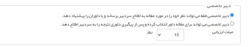 مدیر سامانه اقداماتی را که دبیر تخصصی با توجه به سیاست نشریه میتواند انجام دهد، در بخش تنظیمات نشریه، تنظیمات بیشتر، داوران/ دبیران تعیین میکند.