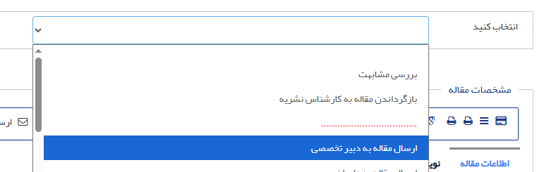 روی کد مقاله موردنظر کلیک کنید، سپس در منوی کشویی انتخاب کنید، روی ارسال مقاله به دبیر تخصصی کلیک کنید.