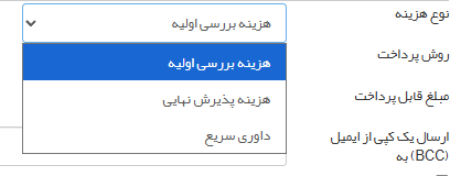 سپس باید نوع هزینه، هزینه بررسی اولیه، پذیرش نهایی یا داوری سریع را انتخاب کنید. لازم به ذکر است که مبلغ این هزینهها باید قبلاً توسط مدیر سامانه در تنظیمات نشریه، تنظیمات بیشتر، پرداخت وارد شده باشد. همچنین متن نامه پیشفرض نیز را نیز مدیر سامانه میتواند در بخش نامههای نشریه تغییر دهد.
