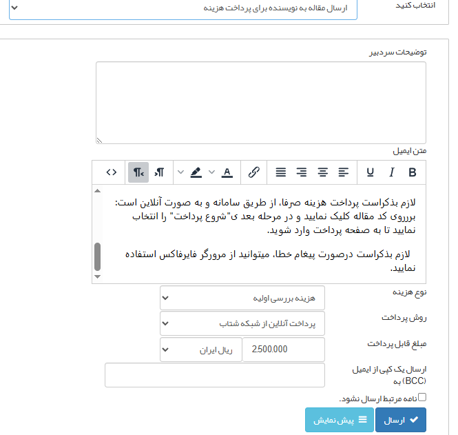 سردبیر میتواند مقاله را جهت پرداخت هزینه به نویسنده ارسال کند.