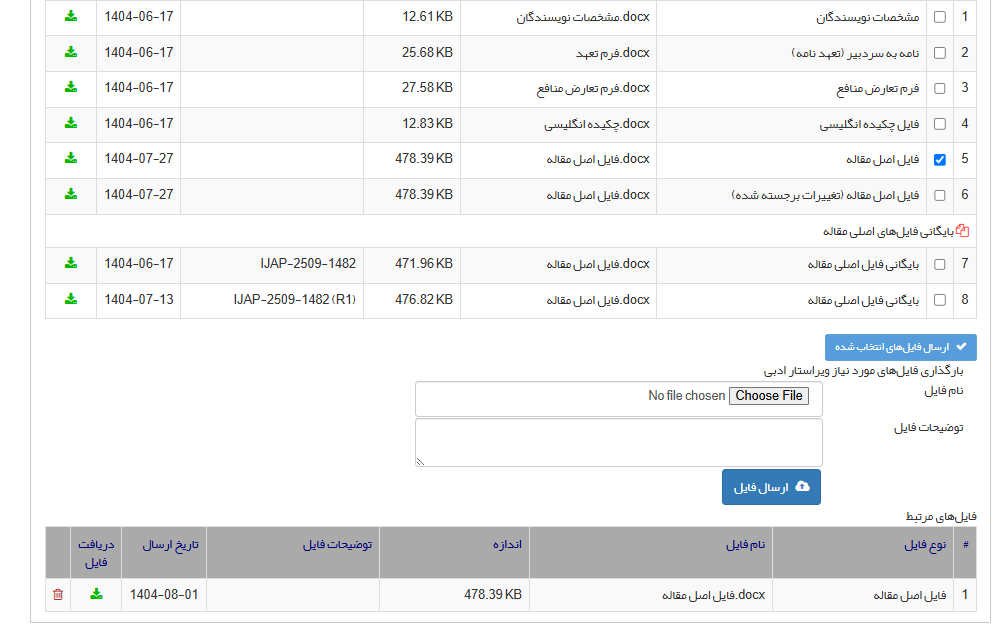 فایلهایی را که لازم است برای ویراستار ارسال کنید، انتخاب کنید. سپس بر روی ارسال فایلهای انتخابشده کلیک کنید تا فایلها را در پایین فرم، ذیل عنوان فایلهای مرتبط ببینید.