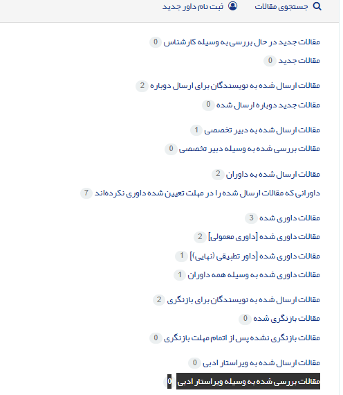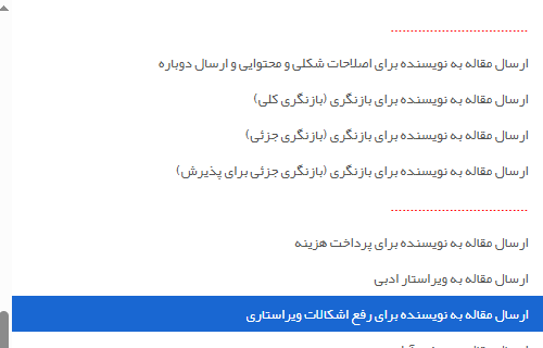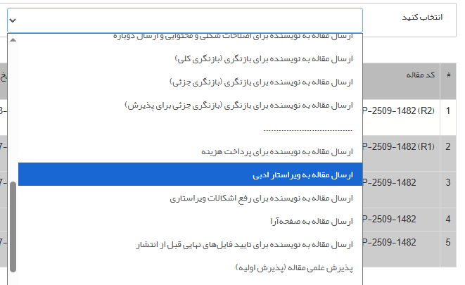 ابتدا روی کد مقاله کلیک کنید. سپس از منوی کشویی انتخاب کنید، روی ارسال مقاله به ویراستار (فنی یا ادبی) کلیک کنید.