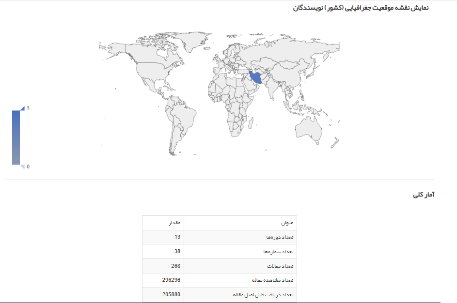 اگر نوع گزارش بر روی مقالات منتشرشده باشد، یک جدول از آمار کلی و همچنین موقعیت جغرافیایی نویسندگان به شما نمایش داده میشود.