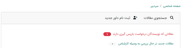 گاهی اوقات نویسندگان به دلایلی درخواست میکنند که مقاله به آنها بازگردانده شود و روند بررسی مقاله در نشریه متوقف شود. در این صورت درخواست بازپسگیری اولین گزینهای خواهد بود که در صفحه سردبیر مشاهده خواهید کرد.