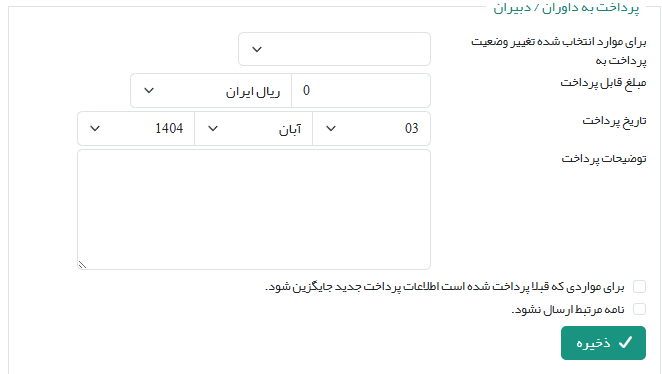 اگر اطلاعات پرداخت جدیدی را ثبت میکنید، میتوانید گزینه مرتبط را انتخاب کنید. اگر نمیخواهید نامه اطلاعرسانی برای داور ارسال شود، گزینه «نامه مرتبط ارسال نشود» را انتخاب کنید. در انتها روی ذخیره کلیک کنید.