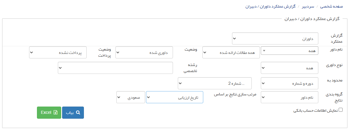 در فرمی که باز میشود، فیلترهای جستجو را تنظیم کنید؛ برای مثال وضعیت را بر روی داوری شده و وضعیت پرداخت را بر روی پرداخت نشده قرار دهید. بازه زمانی را با استفاده از فیلتر محدود به به شماره و دوره معین یا تاریخ خاص محدود کنید. سپس مشخص کنید که نتایج بر اساس نام داور گروهبندی شود یا عنوان مقاله. میتوانید جستجو را برای یک داور خاص یا تمام داوران در یک بازه زمانی مشخص انجام دهید.