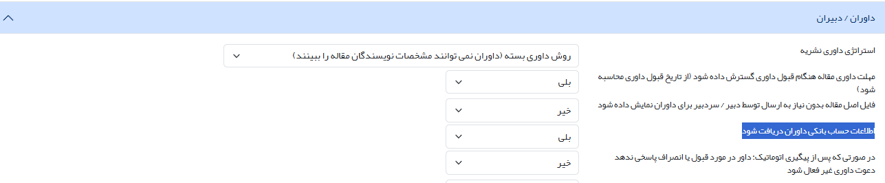 پاسخ: به پنل مدیر سامانه تنظیمات نشریه، تنظیمات بیشتر، بخش داوران/ دبیران مراجعه کنید. مقابل جمله «اطلاعات حساب بانکی داوران دریافت شود» گزینه بلی را انتخاب کنید. به این ترتیب هر بار که داور به صفحه شخصی خود مراجعه کند به او یادآوری میشود که اطلاعات حساب بانکی خود را کامل کند و فقط پس از وارد کردن اطلاعات درخواستی دیگر پیام یادآوری را مشاهده نمیکند.