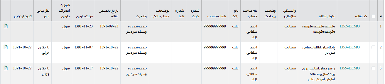 پس از تنظیم فرم جستجو، عناوین مقالات نمایش داده میشود. اگر میخواهید پرداخت را برای تمام مقالات به صورت گروهی ثبت کنید، تیک کنار کد مقاله را در ردیف اول بزنید، در غیر این صورت مقالات را یک به یک انتخاب کنید. دلیل این که مواردی مانند ردیف شماره 1 این جدول امکان انتخاب شدن ندارند، این است که داور نظر خود را ثبت نکرده است.