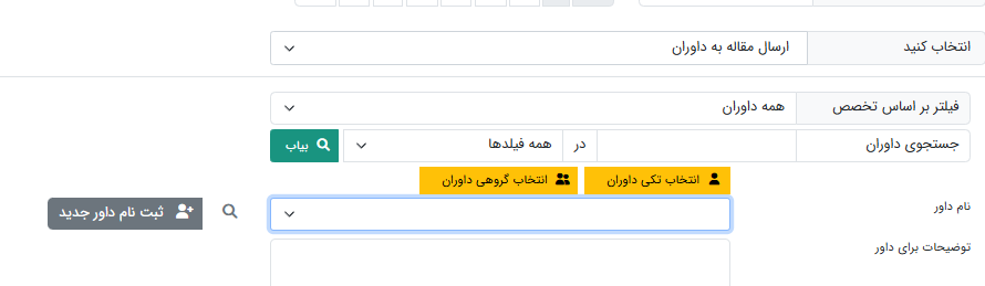 3. استفاده از گزینه "ثبتنام داور جدید" هنگام ارسال مقاله به داور.