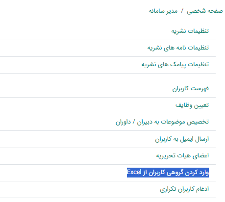 به این منظور به نقش مدیر سامانه -> وارد کردن گروهی کاربران از Excel مراجعه نمایید و اکسل حاوی اطلاعات کاربران را بارگذاری نمایید.