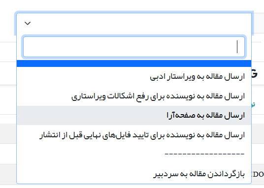 - ارسال مقاله به صفحهآرا: سرویراستار فایل مقاله ویراستاریشده را برای صفحهآرا ارسال میکند (برای مشاهده راهنمای کامل ارسال مقاله به صفحهآرا اینجا کلیک کنید).