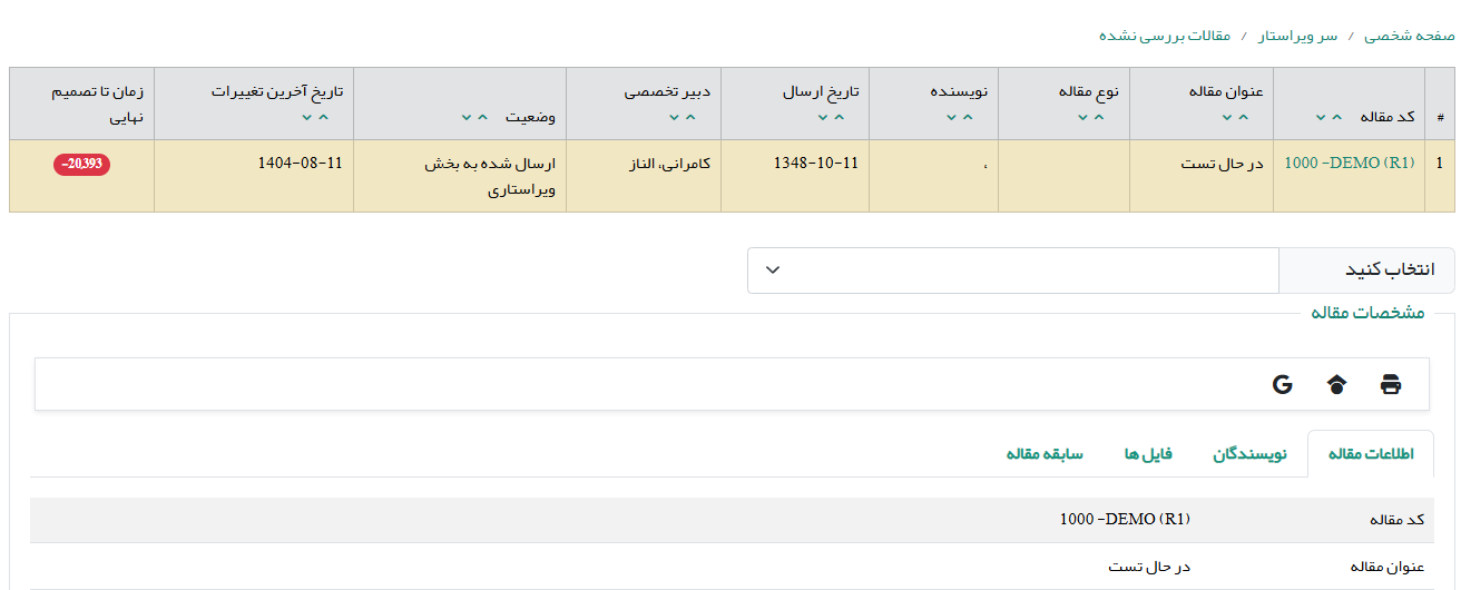 سرویراستار پس از ورود به سامانه و انتخاب نقش سرویراستار وارد صفحه اختصاصی خود میشود. چنانچه سردبیر مقاله جدیدی را برای بخش ویراستاری و سرویراستار ارسال کرده باشد، مقاله در بخش مقالات بررسی نشده قابلمشاهده خواهد بود.